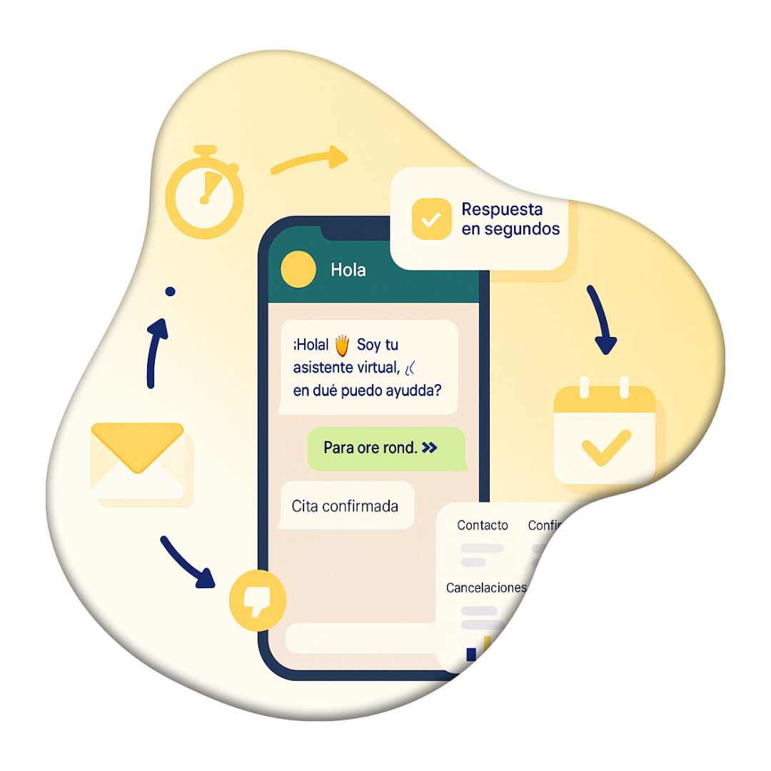Como especialistas en agentes conversacionales para clínicas, configuramos y entrenamos tus agentes para responder en segundos, confirmar y reducir citas canceladas con recordatorios. Centralizamos WhatsApp y correo electrónico, agenda y seguimiento en un solo flujo, y medimos todo (primer contacto, % de confirmación, cancelaciones y aceptación de presupuesto) para optimizar semana a semana. Implementación rápida, soporte cercano y resultados visibles desde el primer mes.